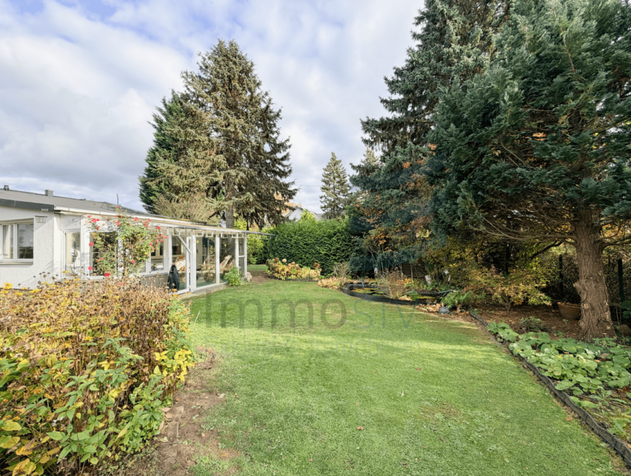 Der liebevoll angelegte Garten ist ein echtes Schmuckstück: Mit seinem gepflegten Rasen, gewachsenen Büschen und einem kleinen Teich lädt er zum Verweilen ein und bietet zugleich viel Platz für individuelle Gestaltungsideen.